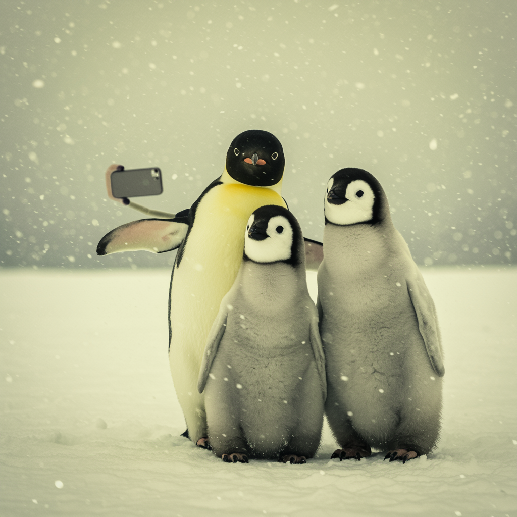 Three adorable penguins pose in a snowy landscape for a selfie, embracing b-movie charm with hyper-realistic bird studies and photo-realistic techniques. The image blends light yellow and dark silver tones, reminiscent of captivating documentary photography, with influences from the Quito school. The scene captures the penguins' playful nature and intricate details of their feathers, set against a dramatic winter backdrop, while maintaining a sense of authenticity and whimsy.