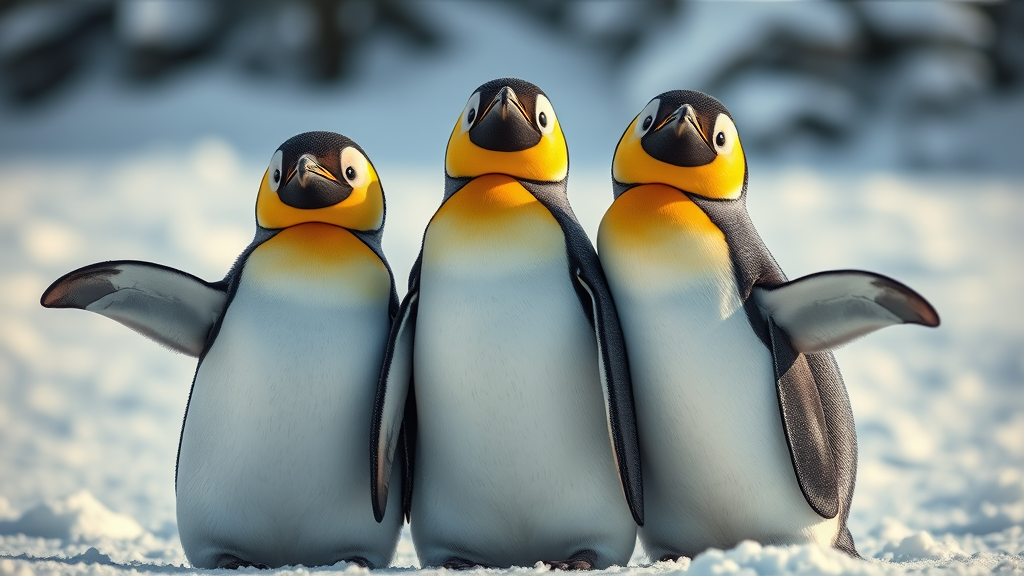 Three adorable penguins posing playfully in the snow, capturing a selfie moment, styled with a b-movie aesthetic flair, showcasing hyperrealism with intricate bird details, using photorealistic techniques with a palette of soft yellow and deep silver tones, reminiscent of captivating documentary photography from the Quito School, where the cold environment highlights their glossy feathers and cheerful expressions against a pristine snowy backdrop.