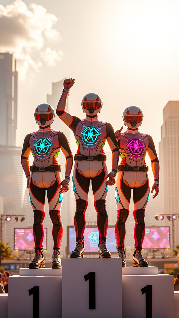 Three futuristic riders stand proudly on a sunlit podium, their vibrant cyberpunk outfits adorned with luminescent logos of various high-tech clubs. The scene is bathed in the golden glow of a summer afternoon, with digital screens flickering in the distance. The camera hovers slightly above, capturing the triumphant expressions of the riders as neon accents shimmer on their suits. In the background, the silhouettes of towering skyscrapers hint at a sprawling cityscape, merging nature and technology in a seamless blend.
