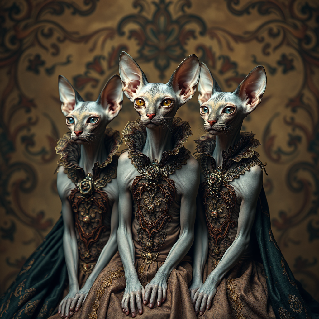 Three hairless sphinx cats poised elegantly, adorned in opulent, fantastical costumes reminiscent of Tim Walker's whimsical style, infused with the imaginative flair of Sacha Goldberger, and subtly accented with the dark, evocative touch of Nicola Samori. The scene is a striking blend of surreal and baroque elements, with intricate textures and rich, moody colors, creating an atmosphere of otherworldly elegance and artistic depth.