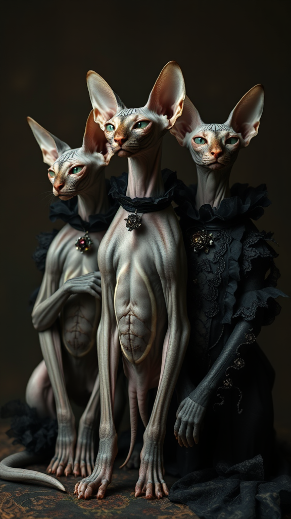 Three hairless sphinx cats posing elegantly, adorned in fantastical, intricately detailed costumes with a gothic allure, reminiscent of Tim Walker's signature surrealistic style. Their theatrical attire blends the aesthetics of Sacha Goldberger's imaginative storytelling with the darkly beautiful, textured nuances found in Nicola Samori's artwork, creating a mesmerizing tableau of whimsy and mystery.