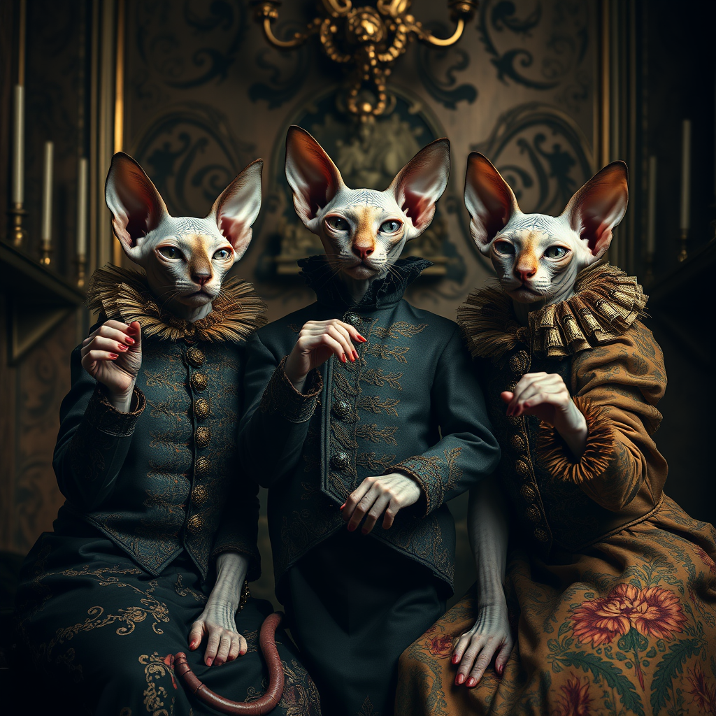 Three hairless sphinx cats striking poses in ornate, theatrical costumes inspired by the whimsical style of Tim Walker, intertwined with Sacha Goldberger's imaginative flair and the haunting touch of Nicola Samori. The scene evokes an elegant yet surreal atmosphere, with intricate textures and rich, dark color palettes, highlighting the cats' graceful and enigmatic presence amidst an opulent backdrop.