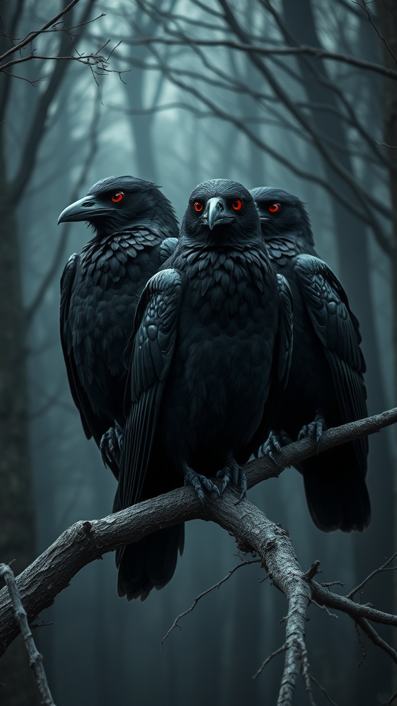 Three imposing ravens perched on a tree branch in a gothic steampunk aesthetic, their eyes a vivid red, emanating a fierce presence. The scene is rich with intricate details, set against the backdrop of a dark, eerie forest. Each raven boasts a unique personality within the same foreboding theme. The environment is captured in stunning 16k resolution, with ultra-high-definition and high dynamic range, ensuring every element is crisply rendered. The forest is shrouded in shadows, creating a mystical and ominous atmosphere. Eyes slightly uncanny in their intensity, adding an otherworldly touch to their gaze. While capturing the essence of the original vision, the image avoids any low-resolution or digital artifacts, focusing instead on a seamless, immersive experience without distractions like texts or signatures.