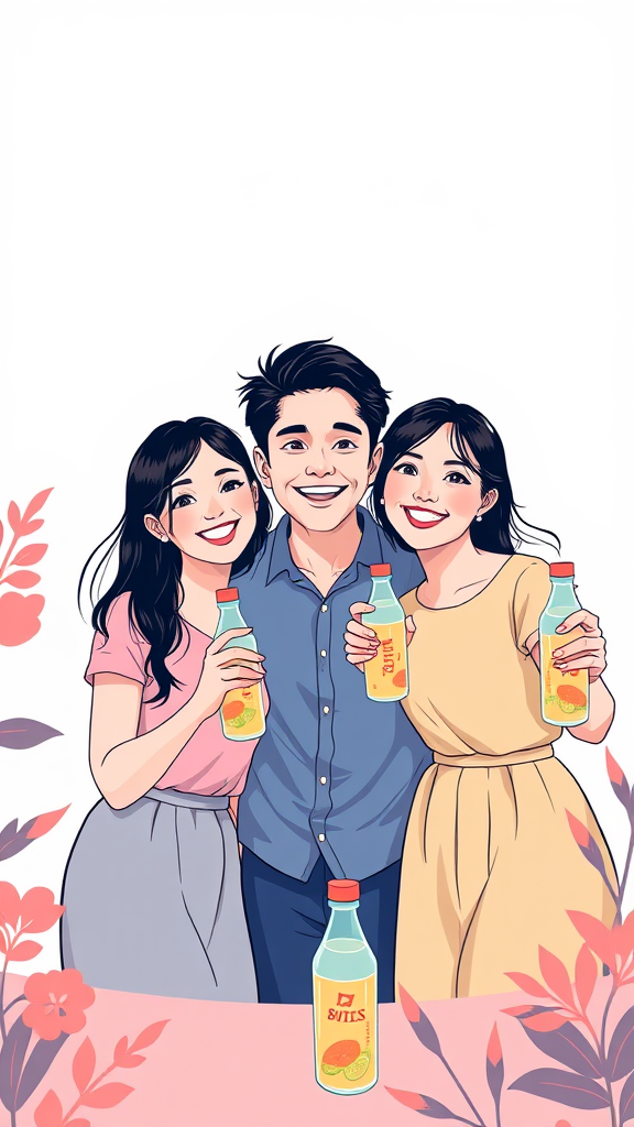 Three joyful Asian individuals, two women and one man, are enjoying drinks from PET bottles in a vibrant, panoramic scene. They are positioned charmingly in the bottom right corner of the composition. The scene is designed in a minimalist, vector illustration style with bright colors and intricate details, capturing a serene and lively atmosphere. The group is surrounded by a simple yet dynamic background that complements their cheerful interaction and adds depth to the high-resolution illustration.