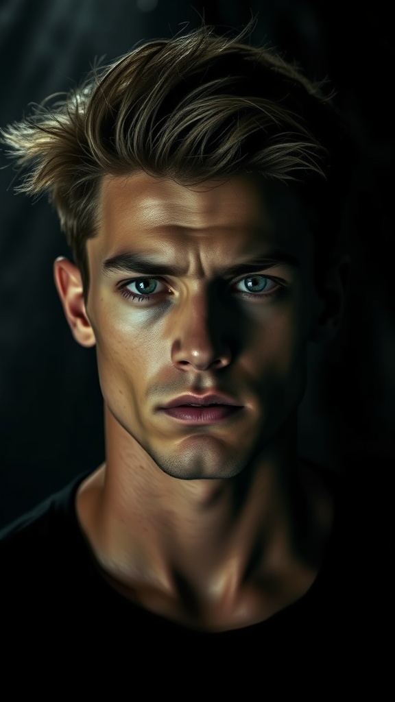 View this AI-generated image featuring three quarter close up portrait of a 30 year old man with a slender athletic figure and a stunning face he has a frowning yet innocent expression with distinctive hair that highlights his features the background is oppressive and contrasting filled with dramati
