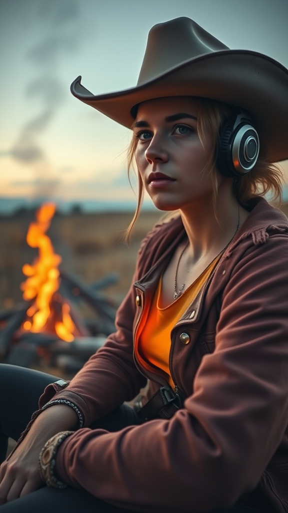 Three-quarter close-up portrait of a 28-year-old cowboy sitting by a campfire on the prairie; western theme; key visual; highly detailed with breathtaking beauty and comprehensive cinematic feel; best quality with ultra sharp focus. The background features a borderlands girl sitting with glowing light on her chest, wearing headphones, showcasing intricate piercings, and adorned with gold rivets. The scene emphasizes natural beauty and the serene prairie atmosphere while avoiding distractions like overcrowding, missing or extra limbs, and poor quality visuals. The overall composition is balanced, clear, and maintains an engaging narrative essence.