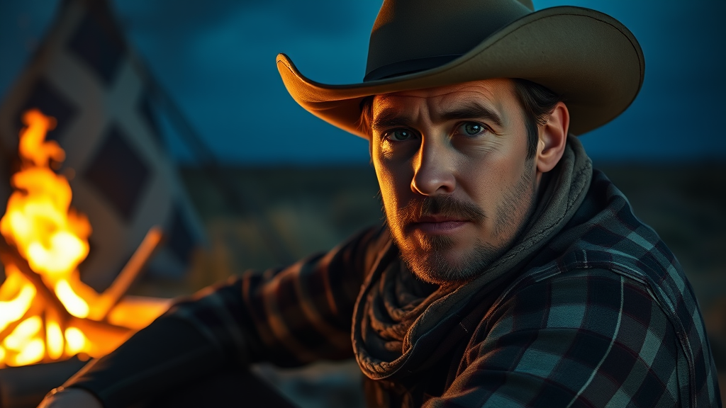 Three-quarter close-up portrait of a 28-year-old cowboy sitting by a campfire on the prairie, western, key visual, highly detailed, breathtaking beauty, comprehensive cinematic, best quality, ultra sharp focus, surrounded by the vast expanse of the borderlands, with subtle background noise. The scene captures the essence of the rugged landscape, while intricate details in his attire and expression reflect his adventurous spirit. A soft glow from the campfire highlights the contours of his face and adds warmth to the cool night air, creating a captivating contrast. Emphasize the cowboy's rugged charm and the serene yet wild environment, avoiding elements like poor quality rendering, distortion, unwanted artifacts, and focusing on a realistic depiction without extraneous or absurd details.