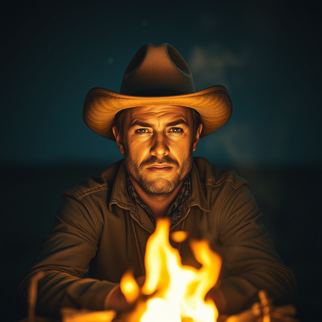 Three-quarter close-up portrait of a 28-year-old cowboy sitting by a campfire on the prairie, western, key visual, incredible detail, captivating beauty, cinematic style, best quality, ultra sharp focus, borderlands theme, background ambiance. Cowboy with a rugged charm, wearing a weathered hat, light from the campfire casting a warm glow on his features. Stars twinkle in the vast sky above, a sense of solitude and adventure in the air. The landscape around him stretches endlessly, capturing the essence of the untamed West. No additional figures, only the cowboy surrounded by the serene nighttime setting, void of imperfections or distortions.