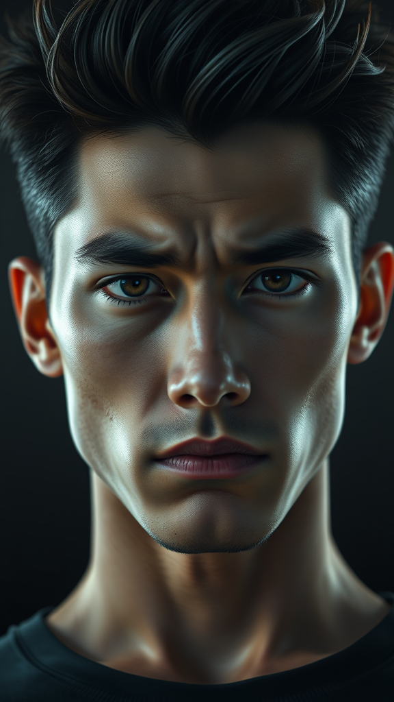 Three-quarter close-up portrait of a 30-year-old man with a slender athletic build and a striking face. He displays a frowning yet innocent expression, highlighted by his expressive eyes and distinctive hairstyle. The oppressive background creates a stark contrast, emphasizing a dramatic and intense atmosphere. The scene appears as if captured in a high-quality cinematic shot from a low angle using a DSLR camera, with settings of aperture f/7, shutter speed 1/100 sec, and ISO 150. This hyper-photorealistic image features intricate textures and natural reflections, imbued with cinematic lighting reminiscent of anime. The background's uncanny allure adds a surreal touch, avoiding any deformations or unnatural anatomy, ensuring perfect symmetry and proportions throughout.