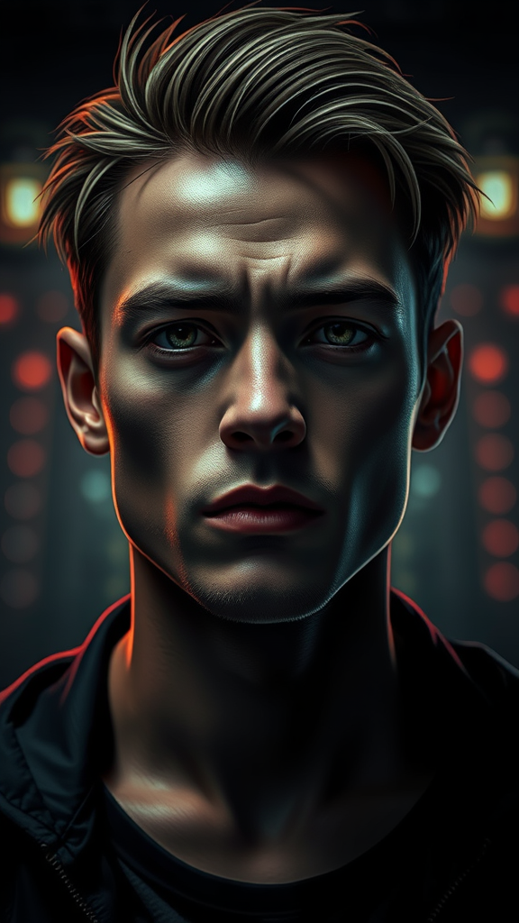 Three-quarter close-up portrait of a 30-year-old man with a slender athletic build and a captivating face, displaying a mix of frowning and innocent expressions. His hair is styled with care, accentuating his striking features. The background is dominated by an oppressive and contrasting atmosphere, featuring dramatic, expressive elements with a gloomy, horror-infused ambiance. Backlighting from indoors adds a cinematic effect. The shot is captured from below using a DSLR with settings at aperture f/7, shutter speed 1/100 sec, and ISO 150. The image is super detailed and hyper-realistic, showcasing natural reflections and cinematic lighting with anime influences. The composition is symmetrical, avoiding any elements that might distract or detract from the central figure's allure. The scene is full of tension and mood, bringing to life a world steeped in mystery and emotion.