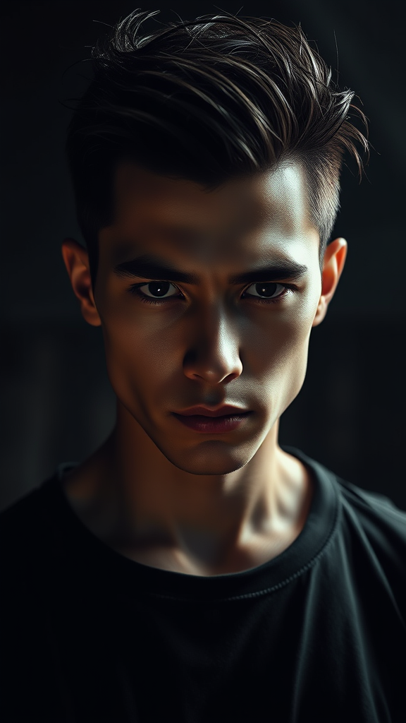 Three-quarter close-up portrait of a 30-year-old man with a slender athletic figure and a captivating face showing a frowning yet innocent expression, complemented by intricately styled hair. The backdrop is oppressive and contrasting, creating a dramatic and expressive mood with elements of a gloomy horror atmosphere. The cinematic shot is captured from below using a DSLR with settings of aperture f/7, shutter speed 1/100 sec, and ISO 150, highlighting super detailed, hyper photorealistic textures with natural reflections. The scene is illuminated by striking backlighting that enhances the emotional depth of the background, adding layers of cinematic and anime-inspired lighting. The overall composition maintains a sense of symmetry within its intricacy, avoiding distortions such as deformities or bad anatomy, and ensuring all proportions are realistic and aesthetically pleasing.