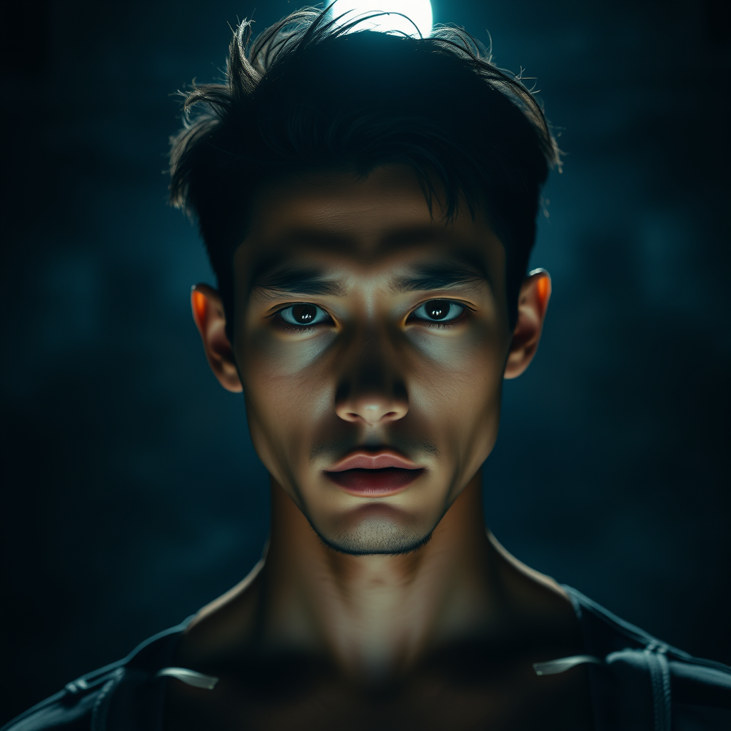 Three-quarter close-up portrait of a 30-year-old man with a slender, athletic figure and a stunning face. He has a frowning yet innocent expression and striking hair, set against an oppressive and contrasting background. The scene is backlit from inside with a dramatic, expressive atmosphere that creates a gloomy, horror-like ambiance. The cinematic shot is captured from a low angle using a DSLR with settings of aperture f/7, shutter speed 1/100 sec, and ISO 150. The image is super detailed and hyper photorealistic, showcasing textures of natural reflections and cinematic lighting reminiscent of anime. Despite the dark theme, there is a bright, almost blinding light enhancing the scene's texture and symmetry.