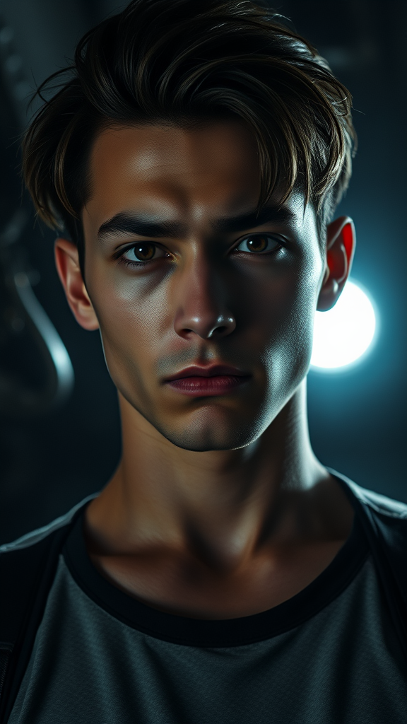 Three-quarter close-up portrait of a 30-year-old man with a slender athletic build and a stunning face, wearing a frown that conveys innocence. His hair is styled with distinct detail, set against an oppressive and contrasting background with dramatic expressive elements. There's a sense of a gloomy horror atmosphere, backlit from inside to enhance drama. The cinematic shot is captured from a low angle with a DSLR, utilizing an aperture of f/7, a shutter speed of 1/100 sec, and ISO 150. The image is super detailed and hyper-photorealistic, with natural reflections and cinematic lighting, reminiscent of anime visuals. The background features elements like heels, bright blinding light, and rivets, creating a sense of symmetry. The focus is sharp, avoiding issues like distortion or low resolution, and lacking any deformations or unrealistic anomalies common in poorly executed imagery. The man appears natural, well-proportioned, and seamlessly integrates into the atmospheric setting, exuding depth and character.