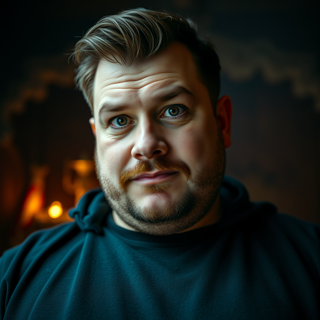 Three-quarter close-up portrait of a captivatingly handsome 30-year-old man with an overweight figure and striking features. He has a tidy goatee and hair, coupled with a curious and friendly expression. The background is oppressive and contrasting, with dramatic and expressive elements creating a gloomy horror atmosphere. The shot is a cinematic capture photographed from below with a DSLR, using an aperture of f/7, a shutter speed of 1/100 sec, and ISO 150. The image is super detailed and hyper photorealistic, showcasing natural reflections and cinematic lighting. It maintains a sense of symmetry, avoiding any deformation, ensuring proper anatomy and proportions, and avoiding any artistic errors such as two heads or duplicated features. The portrait presents the subject in full frame with attention to detail, avoiding any issues like low quality, blurriness, or missing limbs.