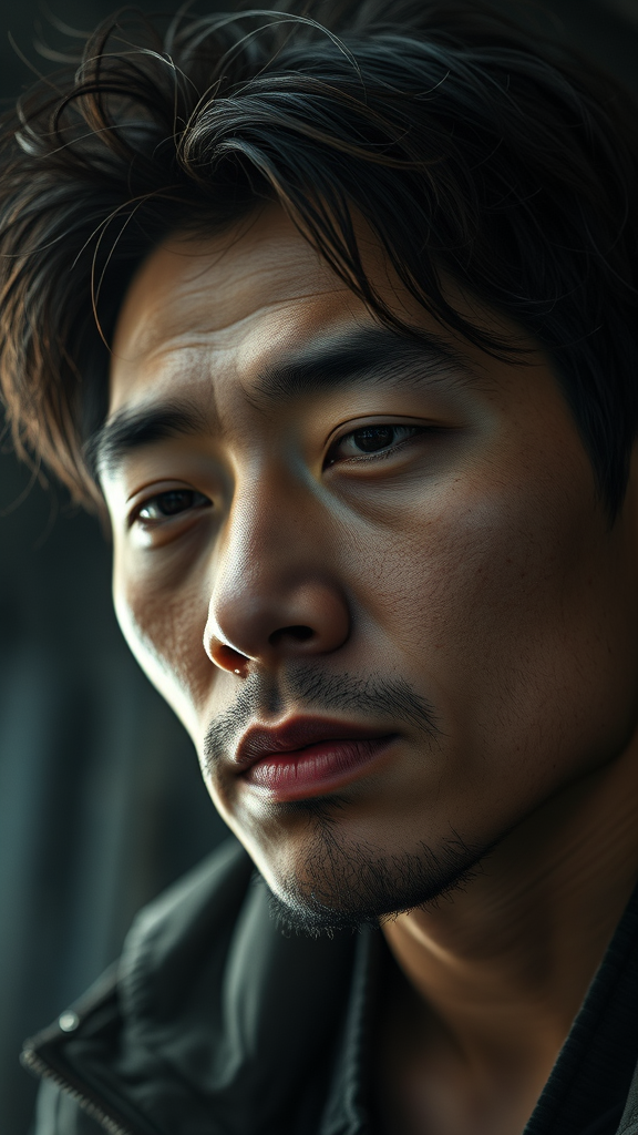 Three quarter close up portrait of a ruggedly handsome 30-year-old Asian man with a dirty and stunningly detailed face, exuding a mysterious and peaceful expression. His hair is subtly tousled, set against an oppressive and contrasting background with elements of dramatic backlighting and a gloomy sci-fi atmosphere. The image captures a cinematic shot from a low angle with a DSLR, aperture set at f/7, shutter speed at 1/100 sec, and ISO 150, lending it hyper photorealistic detail with natural reflections and cinematic lighting.