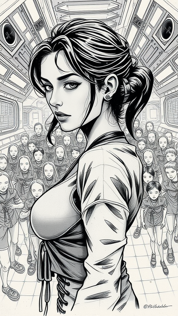 three-quarter close-up portrait of a single woman, secretive expression, full body view, dynamic angles, amidst a zombie outbreak in a city filled with identical people, wearing The Armor of Blood inspired by TMax Bedulenko’s aesthetics, set in a space station, a Provence-style interior, and a vintage classroom from the year 1920; capture a romantic essence with dual faces, two individuals in thought, illustrated concept art, reminiscent of a draft painting; incorporate elements of Ironman and motorbikes featuring a biker with a prominent head, tied shoelaces, two navels, distinct facial hair, pointed footwear like heels, intentionally blurred in parts, challenging anatomy and abstract shapes, fused elements, suggestive censorship with artistic bars, monochrome palette, exploratory anatomy with surreal body parts: liquid textures, elongated features, and additional elements like extra ears or limbs, reflecting an old photograph quality in black and white, cartoonish outlines, capturing that analog feel with layered textures and vintage imperfections.