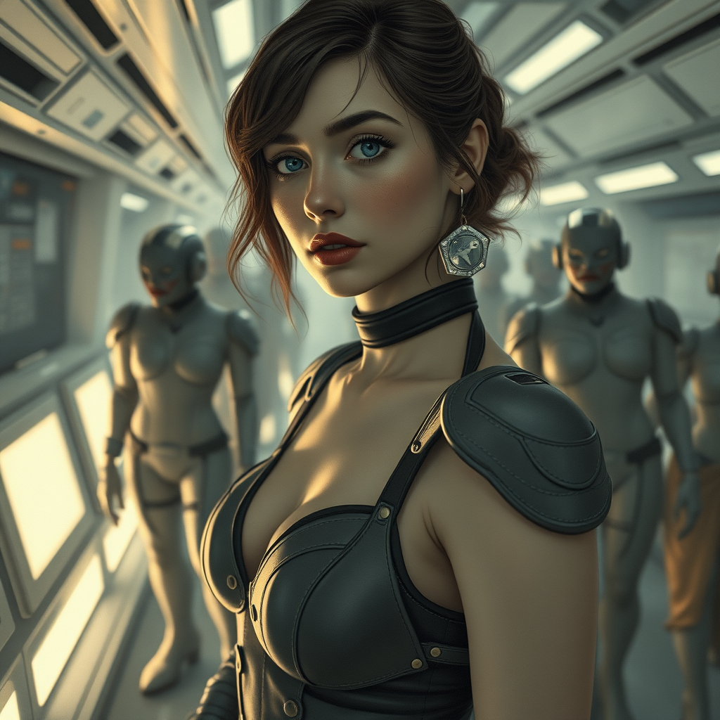 Three-quarter close-up portrait of a single woman in a city with a mysterious atmosphere, amid a zombie outbreak among identical clones. Her appearance reflects a blend of futuristic and romantic 1920s styles, wearing The Armor of Blood. She stands in a space station classroom that exudes a Provence interior charm. Her look is a fusion of characters, slightly reminiscent of a motorbiker with a hint of Ironman influence. Despite the soft lighting, the scene carries an eerie undertone, with subtle elements of disarray—a soft blur in the background and slightly exaggerated features. The composition includes shoes with pointed heels, evoking a slightly surrealist feel. The portrayal is reminiscent of an old photograph, merging multiple artistic styles, including illustrations and sketches. Subtle touches like two navels lend an intriguing and puzzling twist, capturing an uncanny essence within a traditional format.