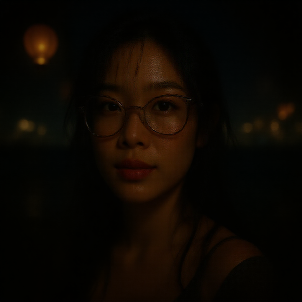Three-quarter close-up portrait of a strikingly beautiful 30-year-old Asian woman with an athletic build and captivating face, featuring a gentle and serene expression and wearing glasses. Her hair is slightly damp, suggesting she's wet from being on the beach at night. It's 11 pm, and the scene is complemented by a dramatic and expressive background, with cool glowing lanterns creating an atmospheric glow. The lights of a nearby town are visible in the distance. The cinematic shot is captured from below with a DSLR camera using a wide-angle lens, aperture f/8, shutter speed 1/250 sec, and ISO 100. She's lit from behind to the side, resulting in super detailed and hyper photorealistic textures with natural reflections and cinematic lighting reminiscent of anime. She's wearing heels, and the scene is bright, with a striking light presence. There are elements of symmetry, enhanced by the glowing atmosphere and subtle reflections on the wet sand.