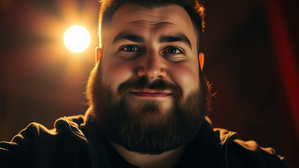 Three-quarter close-up portrait of a strikingly handsome 30-year-old man with an overweight build and a remarkable face, exuding a curious and friendly expression. He has a full, well-kept beard and neatly styled hair. The setting features an oppressive and contrasting background with a dramatic and expressive atmosphere, enhanced by backlighting. The scene is captured in a cinematic style from a low angle using a DSLR, creating a hyper-realistic depiction with super detailed natural reflections and cinematic anime-inspired lighting. The background is vibrant with bright, blinding light, adding to the cinematic effect, while maintaining symmetry and avoiding any visual distortions or anomalies. The result is a harmonious blend of aesthetic and atmosphere, portraying a captivating and intense portrait.