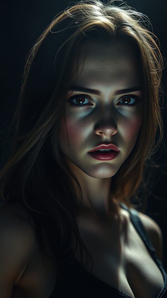 Three-quarter close-up portrait of a stunningly beautiful 30-year-old woman with a slender athletic figure, featuring a captivating face with a frowning yet innocent expression; her hair cascades gracefully. The background is oppressive and contrasting, creating a dramatic and expressive atmosphere with a gloomy horror-like feel. The scene is captured in a cinematic style from a low angle using a DSLR, with an aperture of f/7, shutter speed of 1/100 sec, and ISO 150. The image is super detailed, hyper-photorealistic, highlighting the natural textures and reflections with cinematic anime-style lighting. Bright, blinding light adds to the intensity, creating a powerful visual impact. The composition maintains symmetry and clarity, avoiding any distortions or errors in anatomy and proportions.