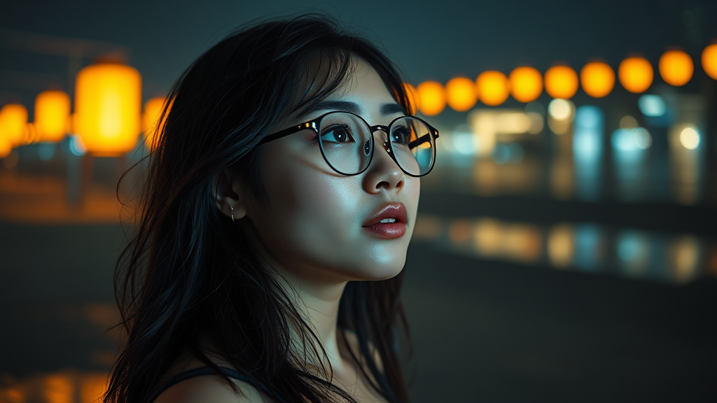 three-quarter close-up portrait of a stunningly pretty 30-year-old Asian woman with an athletic figure and mesmerizing face, wearing glasses and sporting a gentle, serene expression. Her hair flows naturally as she gazes thoughtfully into the distance. It's a wet and mysterious night on the beach at 11 PM, with an evocative and expressive background featuring cool glowing lanterns and the distant lights of a nearby town. The cinematic shot is captured from a low angle using a DSLR with a wide-angle lens, set at an aperture of f/8, shutter speed of 1/250 sec, and ISO 100. She is illuminated from behind and to the side, creating dramatic and detailed natural reflections with cinematic lighting akin to anime. The scene includes textures of bright, nearly blinding light, emphasizing symmetry and beauty without any deformities or unnatural distortions, ensuring a hyper-realistic and visually captivating portrait.