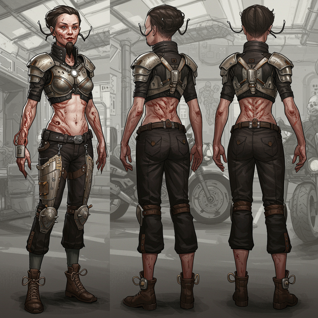 Three-quarter close-up portrait of a woman, set in a city experiencing a zombie outbreak, where everyone appears as clones. She is adorned with The Armor of Blood, envisioned by TMax Bedulenko. The backdrop shifts between a space station, a Provence-inspired interior, and a classroom. The composition captures the romantic style reminiscent of the 1920s, showcasing two faces intertwined in a concept draft. Elements such as Ironman and a motorbike add a futuristic touch, while her attire hints at a biker theme. She has unique features like shoe laces, two navels, a pronounced head, a long beard, and pointed footwear, creating a surreal, almost dreamlike atmosphere. There's an intentional artistic swirl of mutated anatomy, fused fingers, and playful disfigurement, inviting the viewer to embrace an abstract and conceptual interpretation. Her hands appear fluid, and some facial features seem blurred and ethereal, reminiscent of an old black-and-white photo or an analog sketch. The style is cartoonish, low-resolution, with exaggerated proportions, evoking a sense of fantasy.