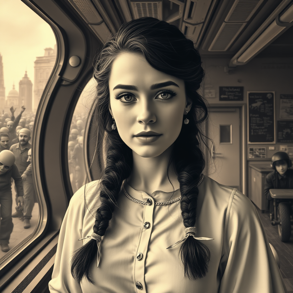 Three-quarter close-up portrait of a woman wearing The Armor of Blood, set against a backdrop of a city overrun by zombie clones. She's standing inside a classroom that resembles a space station with an interior inspired by 1920s Provence. The scene has a romantic style, capturing two faces in concept. The composition includes elements of a draft painting, with influences from Ironman and a motorbike. Accessories like pointed footwear and shoe laces add unique details. Despite some abstract features like a big head and long beard, the portrait maintains an artistic balance. The color palette is a classic black and white, evoking the feel of an old photo with sepia tones. This imaginative scene blurs the line between genres, ranging from historical romance to futuristic adventure.
