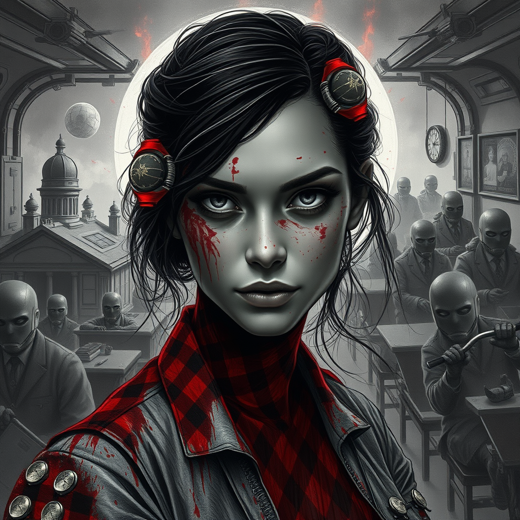 Three-quarter close-up portrait of a woman with a mysterious aura, covered in The Armor of Blood, set against the backdrop of a zombie outbreak in a city filled with clones. The scene transitions through different settings like a space station, a provincial interior, and a 1920s classroom. The artwork combines elements of romantic style from the 1920s with modern concepts, resulting in a unique draft that features motifs from Ironman and motorbiker culture. The composition includes subtle surreal elements like big heads, shoe laces, and pointed footwear. The imagery is vivid yet slightly abstract, with intentional artistic distortions to evoke a sense of eerie beauty and chaotic harmony, embracing a black and white filter to enhance the timeless feel.