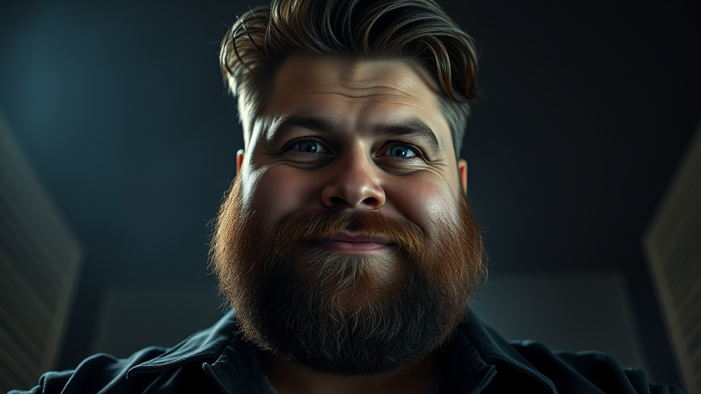 Three-quarter close-up portrait of an exceptionally handsome 30-year-old man with an overweight figure and a compelling face, radiating a curious and friendly expression. He sports a full, well-groomed beard and neatly styled hair. The background is intense and contrasting, with a sense of gloom and horror creating an oppressive atmosphere. The cinematic shot is captured from a low angle using a DSLR with an aperture of f/7, shutter speed set to 1/100 sec, and ISO 150. The scene is super detailed and hyper-photorealistic, with intricate textures and natural reflections. The lighting is cinematic and dramatic, incorporating bright and blinding backlighting. The setting is symmetrical yet deformed, focusing on the man's captivating presence. Careful attention to detail ensures a realistic portrayal without any distortions or abnormalities in anatomy, maintaining a high-quality and focused image.
