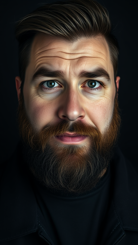 three-quarter close-up portrait, strikingly handsome 30-year-old man, slightly overweight figure, captivating face, with a friendly, inquisitive expression, full well-groomed beard, stylish hair, oppressive and contrasting background, backlighting from within, dramatic and expressive, gloomy and tension-filled atmosphere, cinematic shot from a lower angle with DSLR, aperture f/7, shutter speed 1/100 sec, ISO 150, finely detailed and hyper-realistic, natural reflection textures, dynamic cinematic anime-style lighting, intense brightness, symmetrical elements, maintaining natural proportions, single completed form, clear high-quality resolution, focused and well-composed, visually appealing and accurately proportioned.