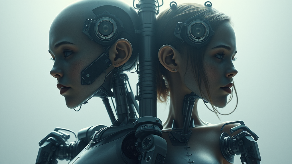 Three-quarter full-body close-up, highly detailed realistic robot in Chappie film style intertwined with a minimalist girl figure, emphasizing a complex composition featuring two heads and two torsos. The scene is enveloped in blinding light, creating a totem-like illusion of two beings with intermingled characteristics. Elements of distortion include mutated limbs, extra appendages, and severe anatomical deviations, resulting in a surreal and abstract portrayal with rough proportions. The figures display overlapping features, such as double faces and duplicated hands, amidst a chaotic ambiance underscored by obesity and blurry transitions. The image is further characterized by a lifeless expression, cloudy eyes, and obscured details, with overlays of round windows and circles contributing to its dreamlike quality.
