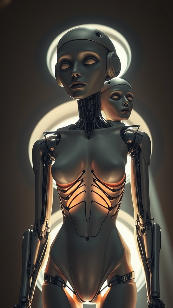 three-quarter full-body close-up, highly detailed realistic robot inspired by Chappie film, minimalist girl figure, enveloped in blinding light, twisted torso with dual heads and faces, resembling a totem, depicting two distinct people. The scene features distorted anatomy with extra limbs and blurred proportions, showcasing mutated and deformed characteristics, yet maintaining an intriguing artistic appeal. The imagery is intentionally rough with exaggerated features like floating limbs, cloned elements, and double features, set against round windows and obscured by oversaturation. The faces exude a lifeless expression with cloudy eyes, embodying a sense of mutation and surreal artistry.