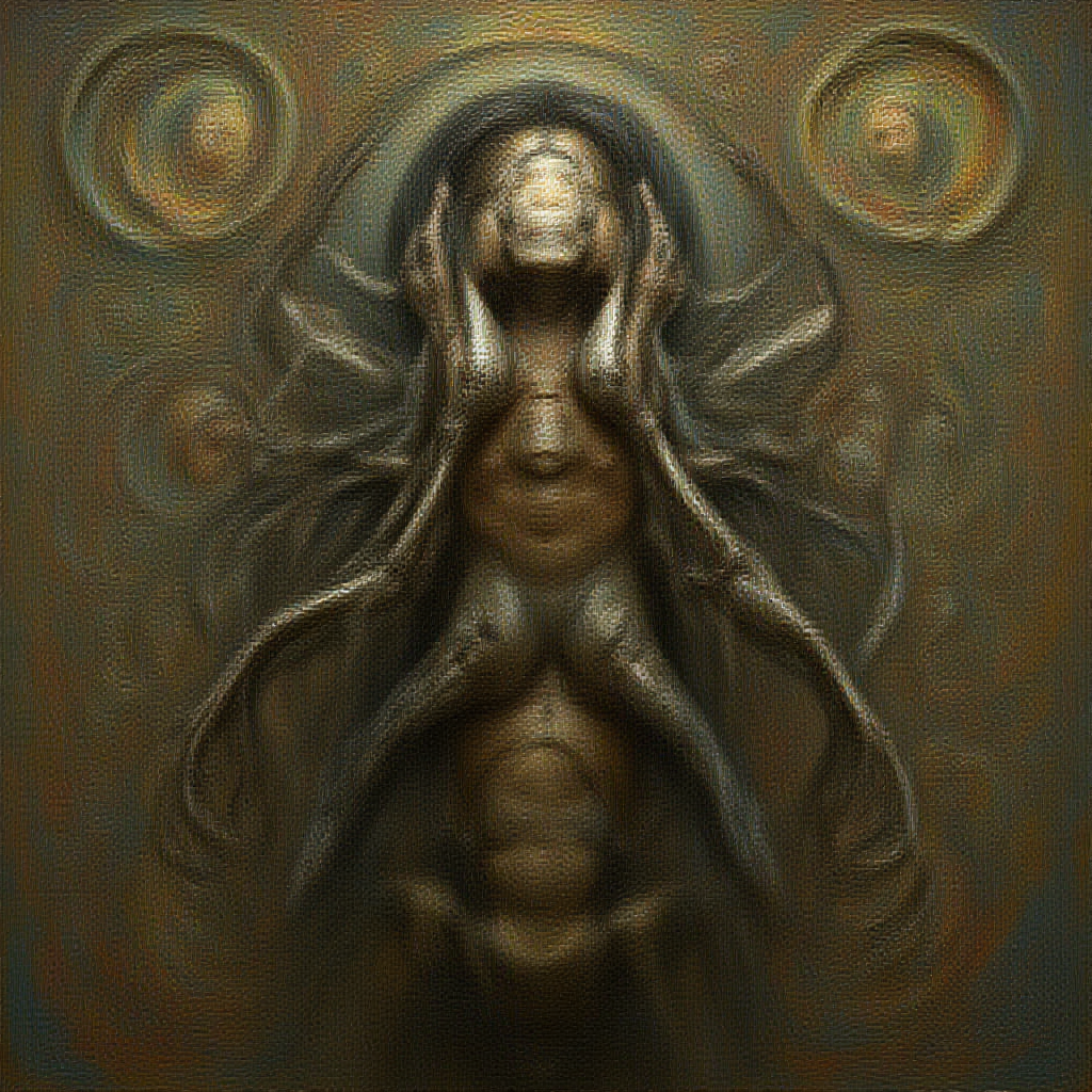 Three-quarter full-body close-up, highly detailed realistic robot resembling Chappie film style, minimalist girl figure with an ethereal presence, enveloped in blinding light, folded torso, dual heads merging, two contrasting faces and torsos forming a totemic visage. Artifacts of distorted and mutated anatomy: extra limbs, cloned facial features, misshapen and floating limbs, evoke a surrealist fusion of forms. Blurry outlines and deformed proportions blend with over-saturated patterns, creating a chaotic field of conflicted beauty. Elements of rough symmetry disrupted by traces of mutations: distorted hands and severed limbs drift into the scene. Features a lifeless expression with cloudy eyes, encapsulated within round windows and circles, conveying an otherworldly aura.