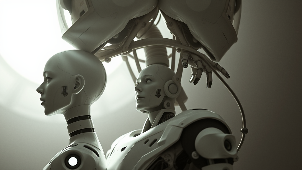 Three-quarter full-body close-up, hyper-detailed realistic robot inspired by Chappie film style, minimalist girl figure alongside, intense blinding light in the background, intertwined torsos, dual heads with distinct faces, dual torsos stacking like a totem, two individuals forming a single entity, asymmetrical features, extra limbs creating an unbalanced look, distorted faces and hands, limbs appearing severed or floating, blurred and dehydrated appearance, disproportionate anatomy with rough and clumsy proportions, presence of cloned and mutated features, oversaturated colors resulting in distortion, visible watermark effect, round window-like elements, cloudy and unfocused eyes, dual bodies with a vacant expression, the essence of a surreal and abstract fusion.