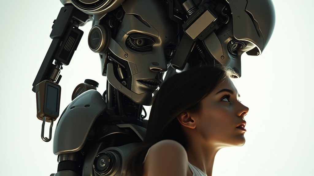 Three-quarter full-body close-up of a highly detailed realistic robot inspired by the Chappie film style, alongside a minimalist girl figure. The scene features a surreal fusion of forms, with two heads, two faces, and two intertwined torsos creating a totem-like structure. The setting is enveloped in blinding light, casting dramatic shadows and reflections. Despite the complexity, the design hints at a sense of deformation, with misplaced features and obscured limbs amidst distorted proportions. Subtle jpeg artifacts and blur effects add a layer of surrealism, while cloudy eyes and doubled expressions evoke an uncanny lifelessness. The composition is both intriguingly peculiar and hauntingly beautiful, with a circle motif subtly integrated into the design, enhancing the otherworldly ambiance.