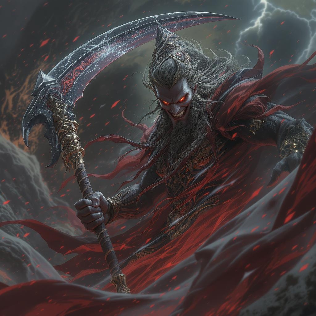 Three quarter portrait of a sinister Greek god Hades, wielding a scythe with a stunning, detailed face showing a cruel and mischievous smirk. He is looking down towards the viewer with ultra-detailed, symmetrical burning eyes and perfect skin. The image is captured with a DSLR 150mm lens at a shutter speed of 1/100, in raw color. It features dramatic, cinematic lighting that highlights the intricately detailed fantasy background. Hades is in an action pose, with an asymmetrical stance. The scene is bright, with blinding light that accentuates natural reflections, rendered in 8k UHD anime style. The setting is bold and emboldened, devoid of deformities or anatomical inaccuracies. The focus is on a clear, high-resolution portrayal with no distortions, rendered in a lifelike, striking manner.