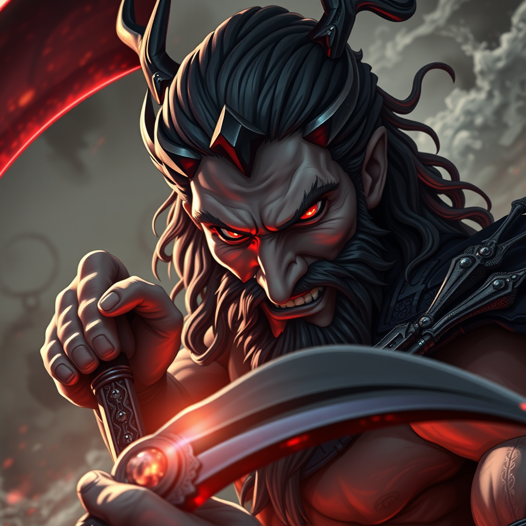 Three quarter portrait of the sinister Greek god Hades wielding a formidable scythe, his face is stunning with a cruel and mischievous smirk. His gaze is directed downwards towards the viewer, displaying ultra-detailed symmetrical burning eyes and perfect skin. He looks emboldened as if captured with a DSLR 150mm lens at a 1/100 shutter speed, revealing vibrant raw colors. The surrounding is a dramatically intricate fantasy background with cinematic lighting, enhanced by textures reflecting natural light. Hades strikes an action pose, slightly asymmetrical, rendered in 8k UHD with anime-style elegance. Bright, almost blinding light emanates from around him, casting rivets of illumination across his form. The image avoids undesirable elements like deformations or multiple limbs, maintaining a high-quality portrayal.