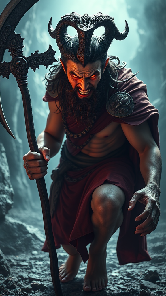 Three-quarter portrait of the sinister Greek god Hades holding a scythe, with a stunning, cruel, and mischievous face. He has a smirk and is looking down towards the viewer. The image is ultra detailed with symmetrical burning eyes and perfect skin. Hades is emboldened in an action pose with an asymmetrical position. The scene is captured in 8k resolution with a DSLR 150mm lens at a shutter speed of 1/100. Featuring raw colors, cinematic lighting, and textures of natural reflections against an intricately detailed fantasy background. His heels are visible amidst the blinding, bright light. The overall composition maintains dramatic and symmetrical elements while avoiding any low-quality aspects or anatomical distortions. The image emphasizes clarity, detail, and visual harmony.