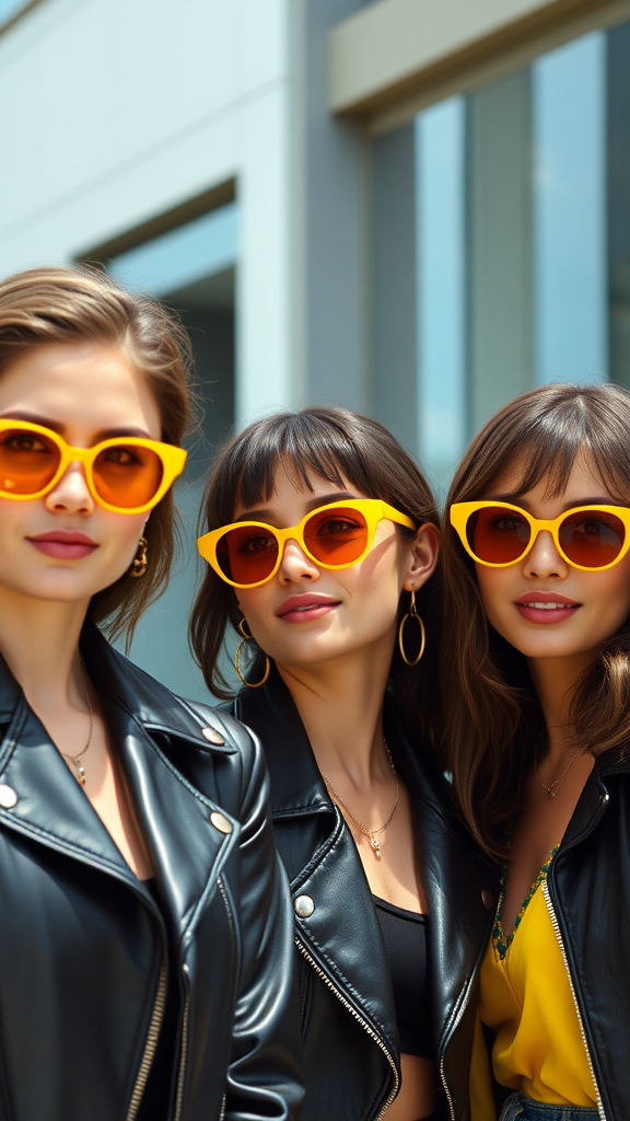 Three stylish women wearing vibrant yellow sunglasses and sleek black jackets, captured in a 1990s trillwave aesthetic. Imagine the moment as a series of looped animated GIFs, with each woman exuding a laid-back yet effortlessly chic vibe. The scene is reminiscent of candid celebrity snapshots, where each frame feels like a fleeting moment of cool confidence under a VHS-filtered lens, mixing authenticity with retro charm.