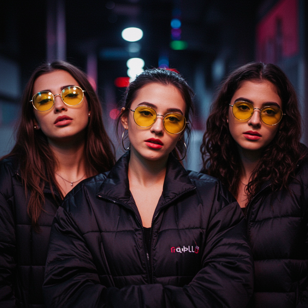 Three stylish women wearing yellow sunglasses and black jackets, captured in a vibrant 1990s trillwave aesthetic, evoke the candid charm of celebrity snapshots. Their expressions and movements are subtly animated in a retro VHS-inspired animated gif style, adding a nostalgic flair with a touch of modern creativity.