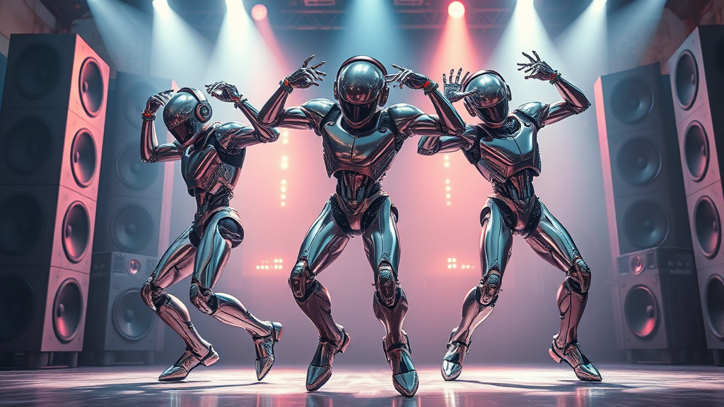 Three vibrant, futuristic robots are captured mid-performance in an epic breakdance battle. Their metallic bodies glisten under the spotlight, moving with acrobatic grace and precision. Large speakers tower in the background, pulsing with energetic music that drives their animated moves. The scene is a photography masterpiece, showcasing the robots' detailed, realistic skin textures in stunning, ultra-high-definition 8k quality. The shot is intensely focused on the full-length frame of the dancers, using diffused soft lighting and a shallow depth of field to create a hyperrealistic effect. This cinematic image portrays the artistry of CGI in sharp detail, avoiding any imperfections or artifacts typically associated with low-quality images, such as distortions, poor anatomy, or duplicated elements.