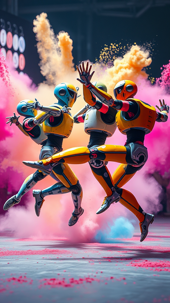 Three vibrant, futuristic robots engage in an exhilarating breakdance battle, showcasing their acrobatic skills against a backdrop of colorful powder explosions. Captured in a photo-realistic, highly detailed 8K frame, the scene breathes life into each robot's intricately designed and textured surfaces. The atmosphere is enhanced by diffused soft lighting, creating a cinematic experience with a shallow depth of field and sharp focus. Emphasizing hyperrealism, each robot's movements are fluid and dynamic, set amidst a CGI-crafted environment that highlights their athletic prowess. The composition remains intact, avoiding common flaws such as blurred or distorted details, ensuring a captivating visual without errors or artifacts.