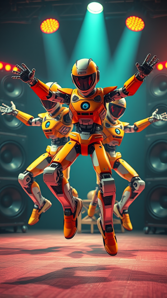 Three vibrant robots energetically performing breakdance moves in a lively dance battle, showcasing impressive acrobatics. A backdrop of large speakers enhances the electrifying atmosphere as music pulses through the scene. Captured in a photo-realistic style, the robots exhibit intricate details, with lifelike textures and vivid colors. The shot is rendered in 8k resolution, offering high detail and a sense of realism. The image features diffused soft lighting and a shallow depth of field, creating a sharp focus on the robots amid cinematic CGI lighting. Despite being a 3D creation, the scene maintains hyperrealism. The composition avoids low quality, errors, and disfigured elements, presenting the scene in its full length with perfect anatomy and proportions for a captivating visual experience.
