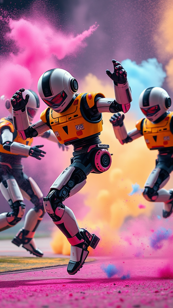 Three vibrant robots engaged in an energetic breakdance battle, showcasing impressive acrobatics amidst bursts of colorful powder. Captured in breathtaking photography, the robots are depicted with detailed textures and realistic features, fully framed in 8k resolution. The scene is masterfully lit with diffused soft lighting and a shallow depth of field, ensuring sharp focus and hyperrealistic quality. Cinematic CGI lighting enhances the mood, presenting each robot with high detail in RAW color art. The composition avoids imperfections such as reduced quality, artifacts, or distortions, maintaining excellent anatomy and proportions throughout.