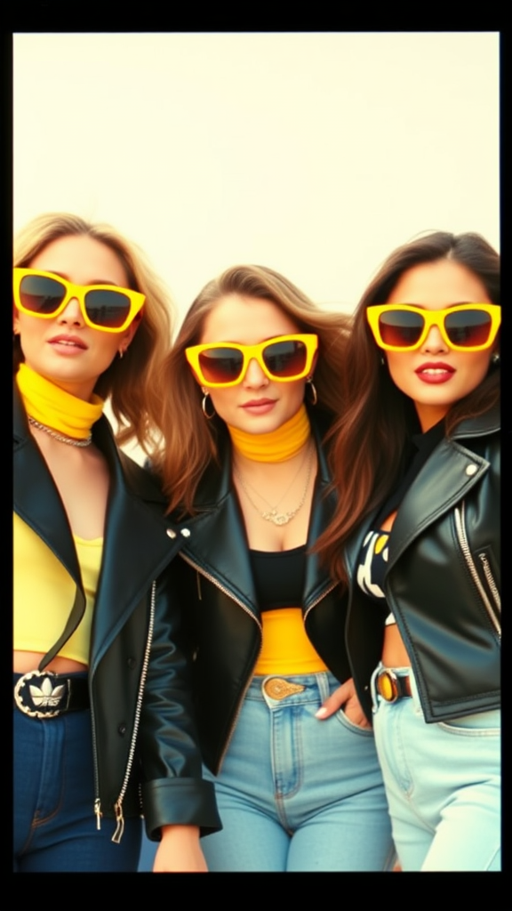 Three vibrant women sporting retro yellow sunglasses and sleek black jackets, captured in the nostalgic style of 1990s VHS, their animated poses reminiscent of candid celebrity moments, infused with trillwave aesthetics, each frame a dynamic gif-like snapshot, encapsulating the carefree, bold spirit of the era.