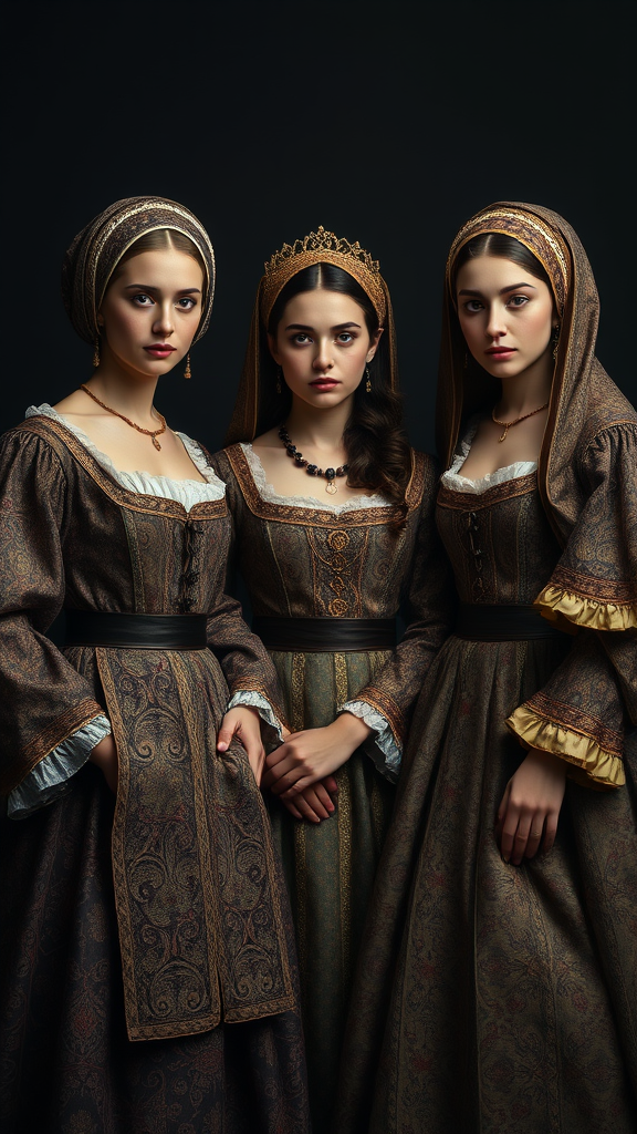 Three women in elaborate renaissance costumes pose against a dark backdrop, captured in the style of contemporary realist photography. Their attire blends rich textures and intricate patterns reminiscent of green academia and Ottoman art. The scene is infused with fine, realist details, evoking the elegance and depth of classic portraiture. The composition frames their expressions and the subtle interplay of fabric and shadow, conjuring an atmosphere that is both timeless and modern, while adhering to an immersive portrait aspect ratio.