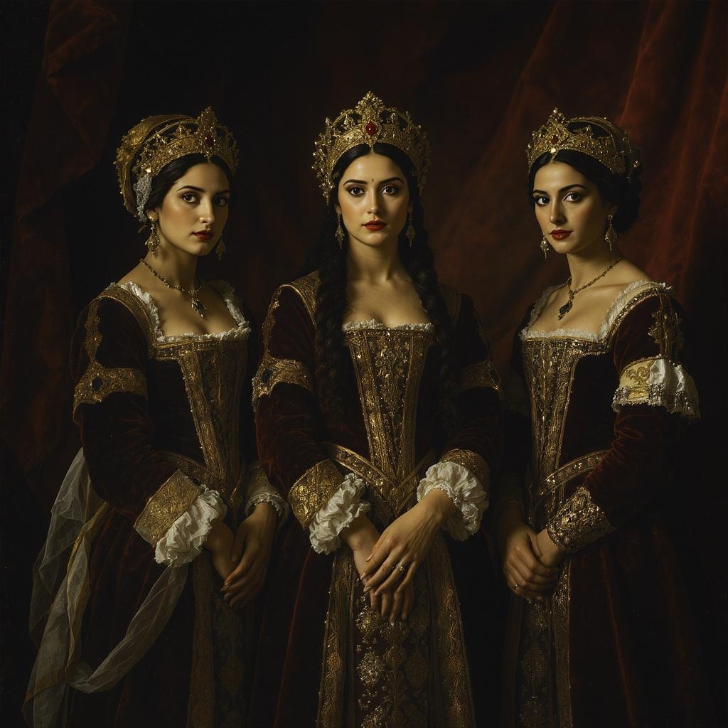 Three women in elaborate renaissance costumes stand against a dimly lit backdrop, embodying the essence of contemporary realist portrait photography. Their attire is richly adorned, drawing subtle yet striking influences from green academia aesthetics and traditional Ottoman art. The focus on intricate, realistic details brings their expressions and textures to life, set in a tall portrait aspect ratio. The scene captures a blend of historical and artistic styles, merging past and present through an exquisite visual narrative.