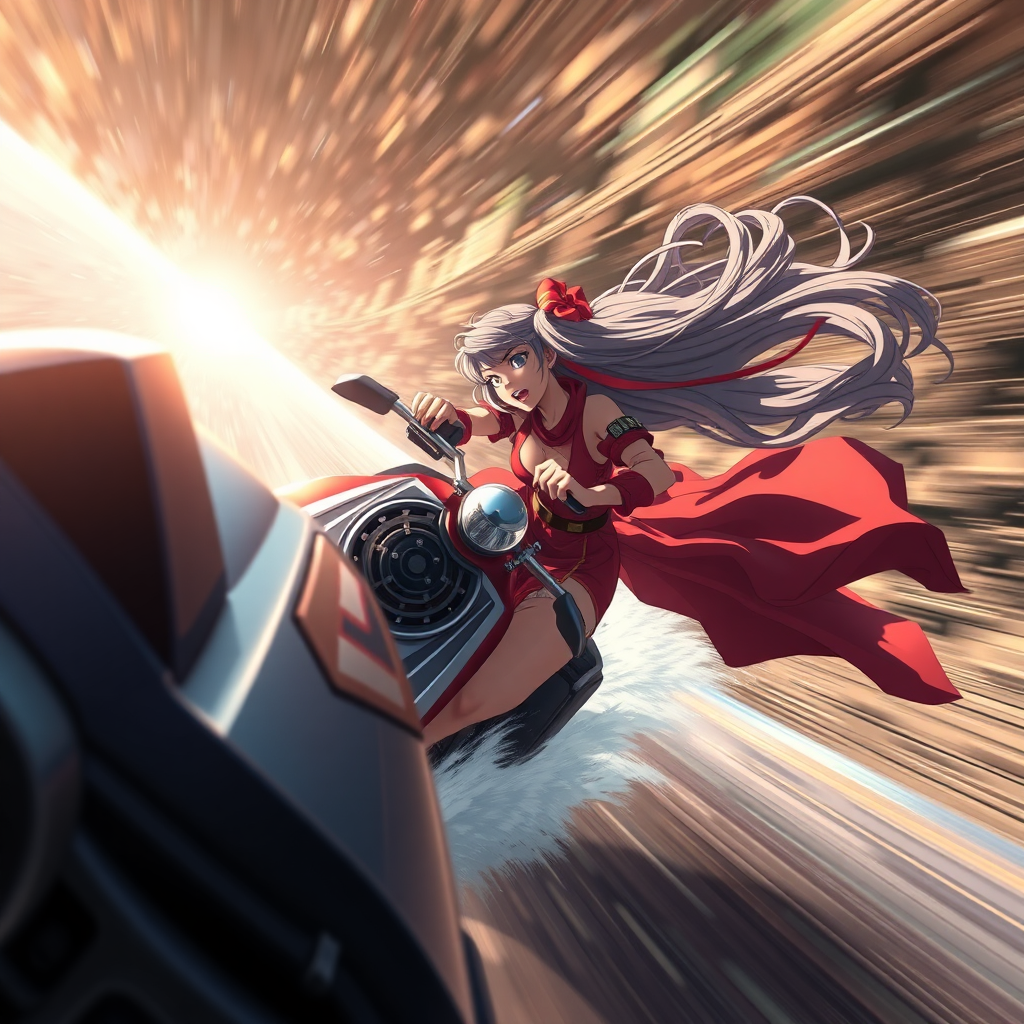 Thrilling high-speed pursuit, dynamic motion, breathtaking action sequence, stunning rogue princess in a vibrant, animated style, reminiscent of Miyazaki, photorealistic and hyper-detailed visuals, rich colors, wind-swept hair, flowing garments, intense focus, cinematic atmosphere, niji 5 inspiration.