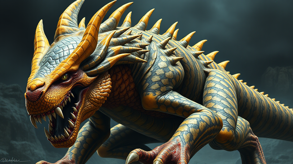 Tigrex from Monster Hunter, intricate scales, vivid eyes, realistic anatomy, ultra-high definition, exceptionally detailed, raytracing effects, vibrant colors, stunning, expressive, masterpiece, oil painting aesthetic, lowres, anatomical inaccuracies, awkward limbs, illegible text, missing features, extra appendages, fewer digits, poor quality, cropped composition, standard quality, compression artifacts, blurred details, artist watermark, indistinct, signature visible, name included, distorted features, absent limb, awkward hands, additional digits, abnormal fingers, inadequate fingers count, floating facial element, disconnected.