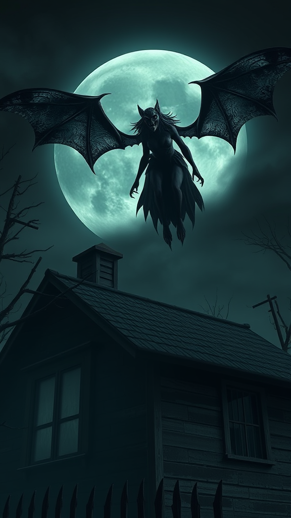 Tiktik, a sinister female creature with leathery bat-like wings and razor-sharp fangs, hovers ominously over the rooftop of an old, eerie house. The full moon casts an ethereal glow, illuminating her menacing silhouette in the dark, macabre night. Inspired by Philippine Folklore, this scene captures a haunting atmosphere with hyperrealistic detail, using high-definition 8k rendering. The setting is crafted in a 3D render style reminiscent of unreal engine technology, ensuring each element is vividly expressive and immersive.